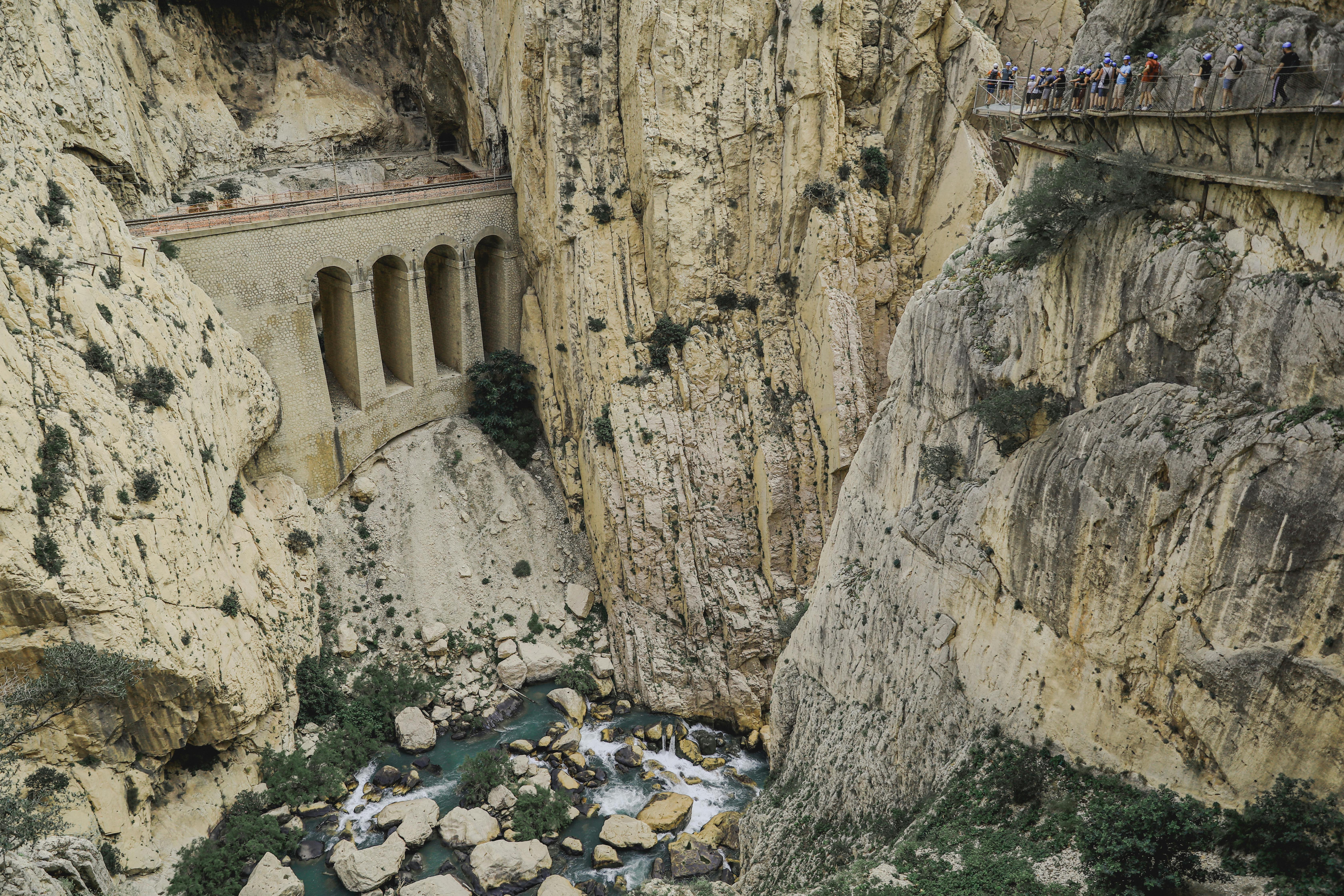 El Caminito del Rey es una pasarela peatonal colgada en las paredes del Desfiladero de los Gaitanes, en la provincia de Málaga. Suspensa a más de cien metros sobre el río Guadalhorce, atraviesa cañones espectaculares y túneles de roca, convirtiendo la ruta en una experiencia paisajística única y apta para visitantes tras su completa rehabilitación.